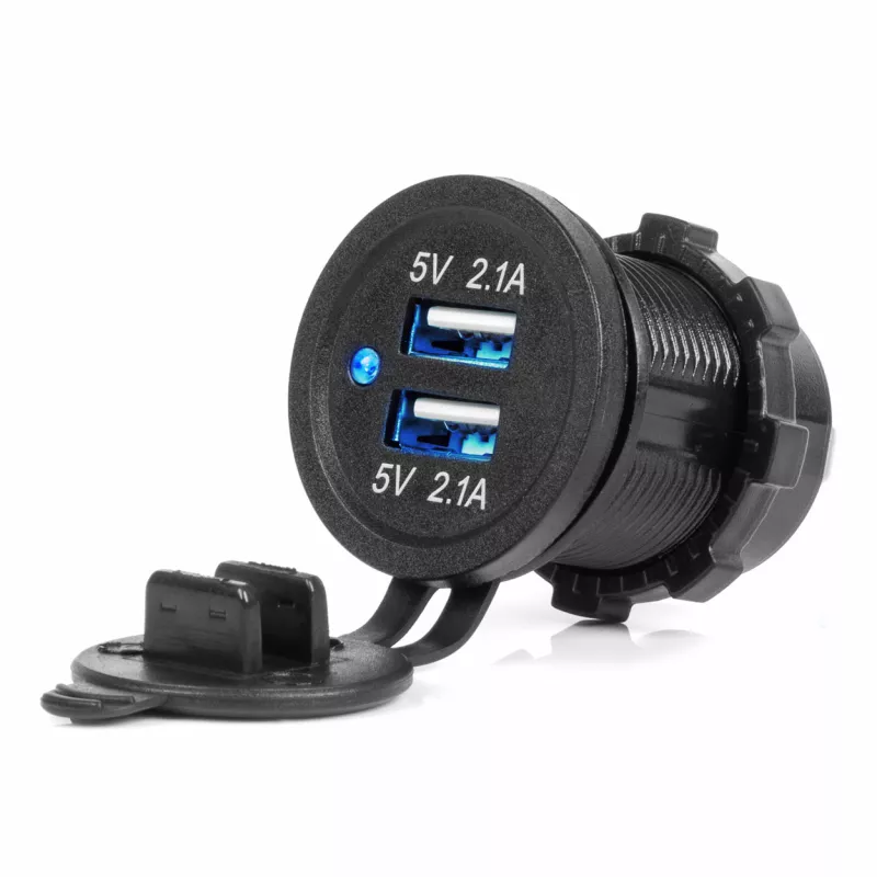 Chargeur étanche avec deux ports USB totalisant 4,2A, compatible 12/24V pour voitures, bateaux et conditions extérieures