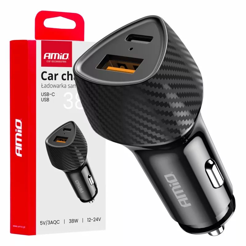 Chargeur de voiture moderne avec deux ports : USB-A et USB-C, offrant une puissance totale de 38W pour une charge rapide et efficace