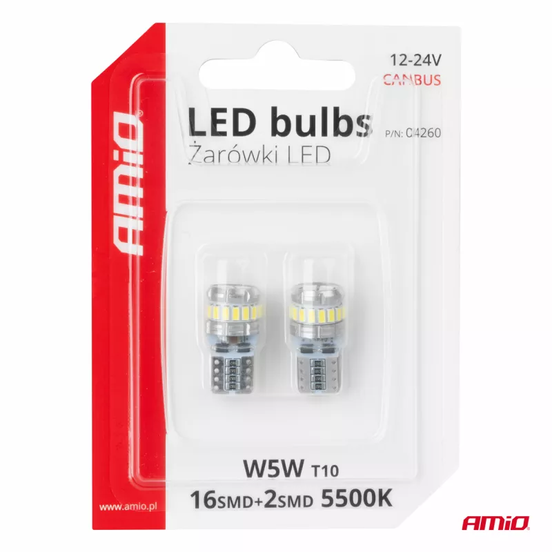 Ampoules LED CANBUS T10 W5W 16SMD 2SMD 3014 3030 Blanc 12V 24V - AMIO - 04260