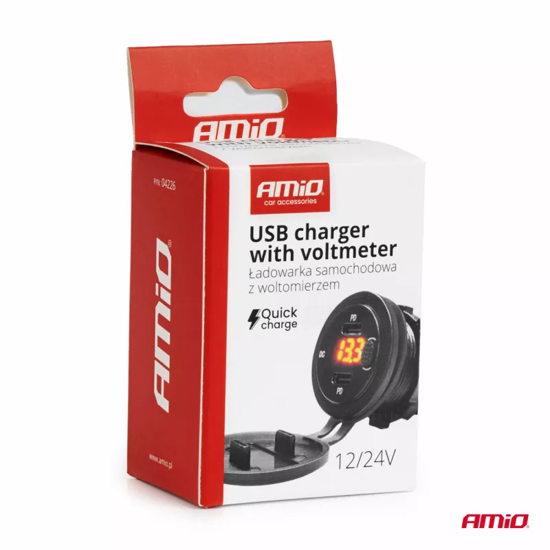 Chargeur de voiture avec ports USB et testeur de tension étanche avec interrupteur 2x USB-C 12V 24V - AMIO - 04226