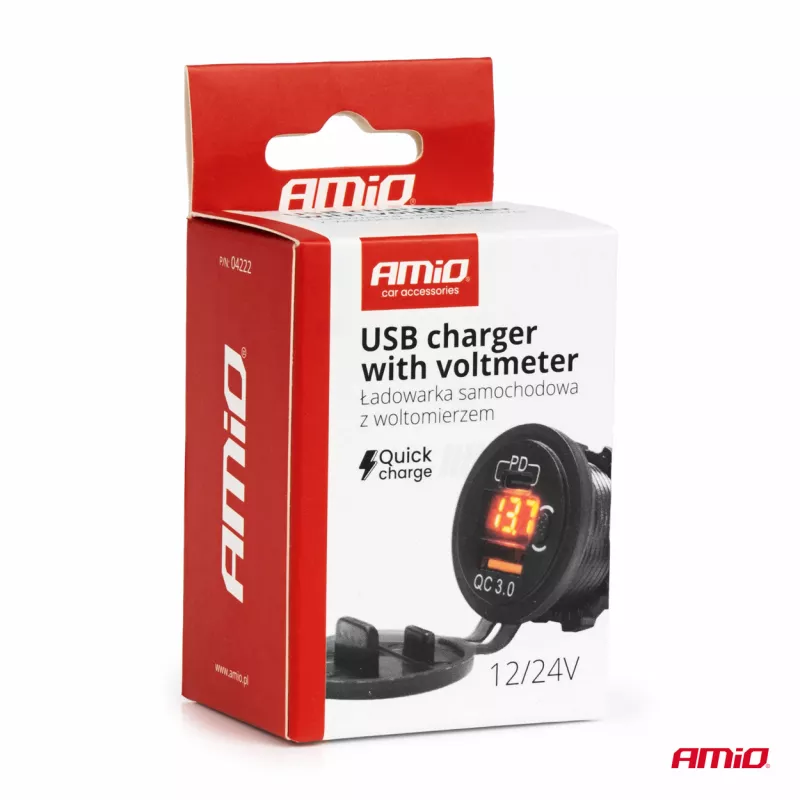 Chargeur de voiture avec ports USB et testeur de tension étanche avec interrupteur USB + USB C QC3.0 12/24V - AMIO - 04222