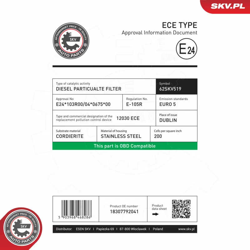 Filtre à particules / à suie, échappement ESEN SKV - 62SKV519