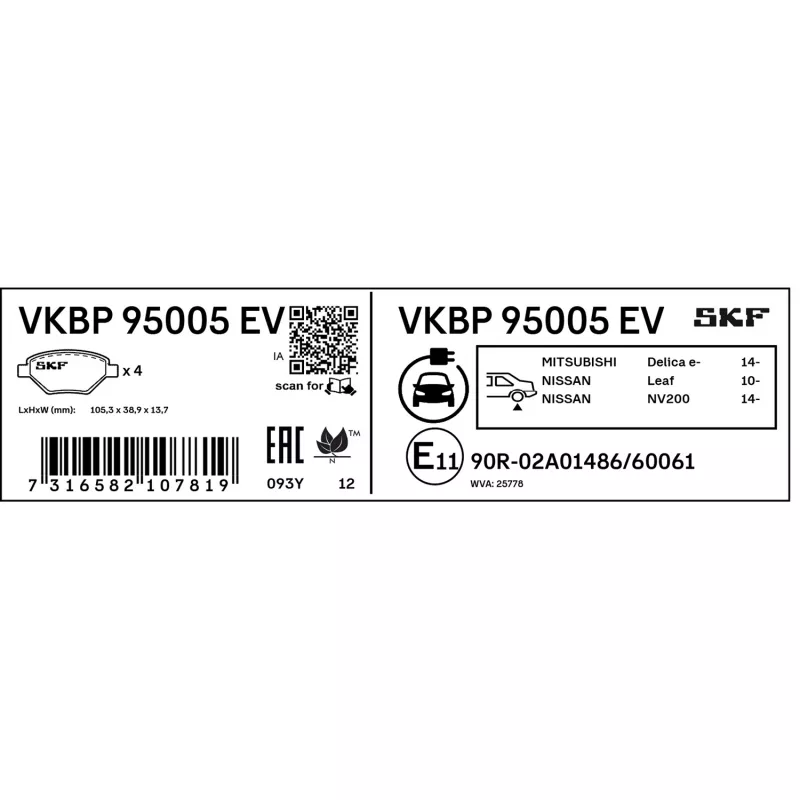 Jeu de 4 plaquettes de frein arrière SKF - VKBP 95005 EV